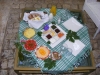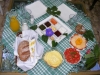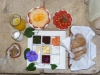 Il comprend du pain au levain et aux noix fait maison. Des fromages d’une laiterie locale, du saumon fumé sur place, des graines de céréales préparées par Aviv et des confitures maison préparées par Koby à base de fruits des vergers de Rosh Pina. Fruits et de légumes frais.